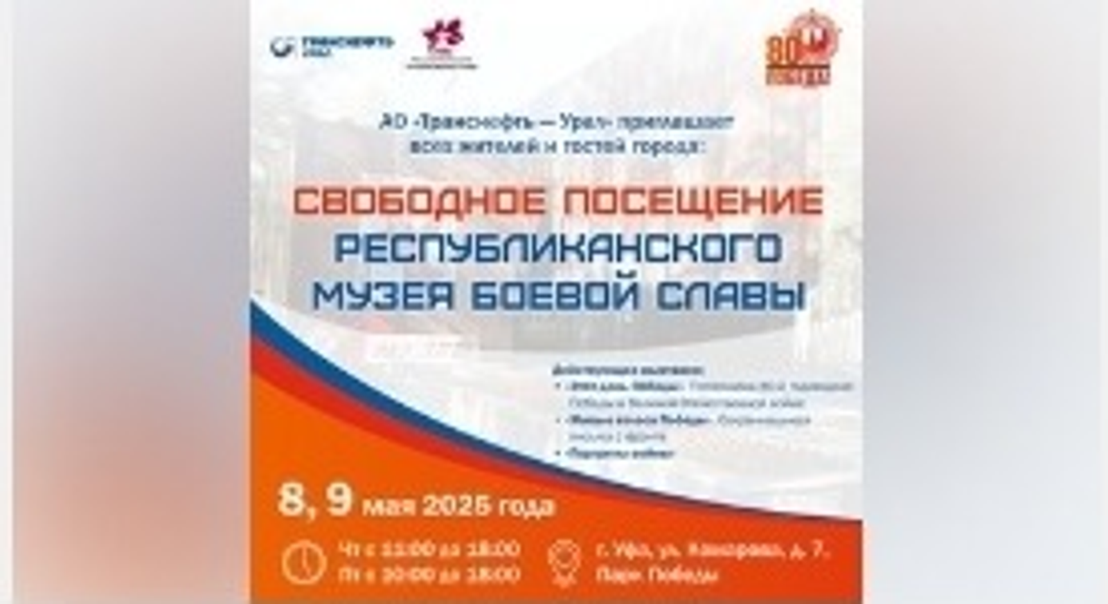 АО «Транснефть – Урал» совместно с Республиканским музеем боевой славы в рамках празднования 80-летнего юбилея Победы в Великой Отечественной войне проведут благотворительную акцию, в ходе которой все желающие 8 и 9 мая смогут бесплатно посетить музей.