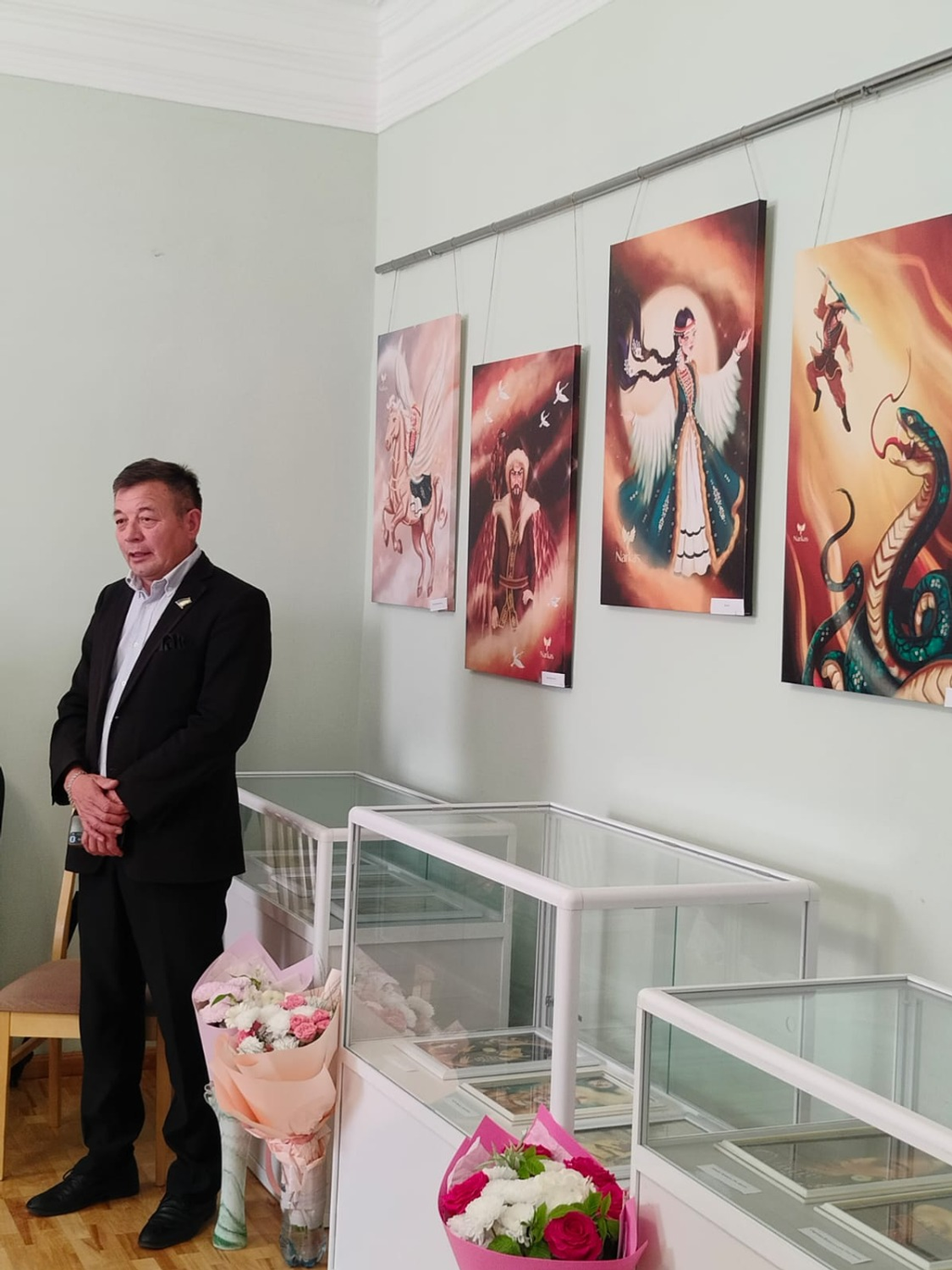Наркас Асхатовна представила выставку «Фольклорные мотивы в моем творчестве» — цикл иллюстраций, созданных по мотивам башкирских народных эпосов «Урал батыр» и «Акбузат». Яркие краски и выразительные образы позволили гостям и посетителям выставки совершить волшебное путешествие вглубь мифического мира, где древние сказочные сюжеты оживают на холсте.