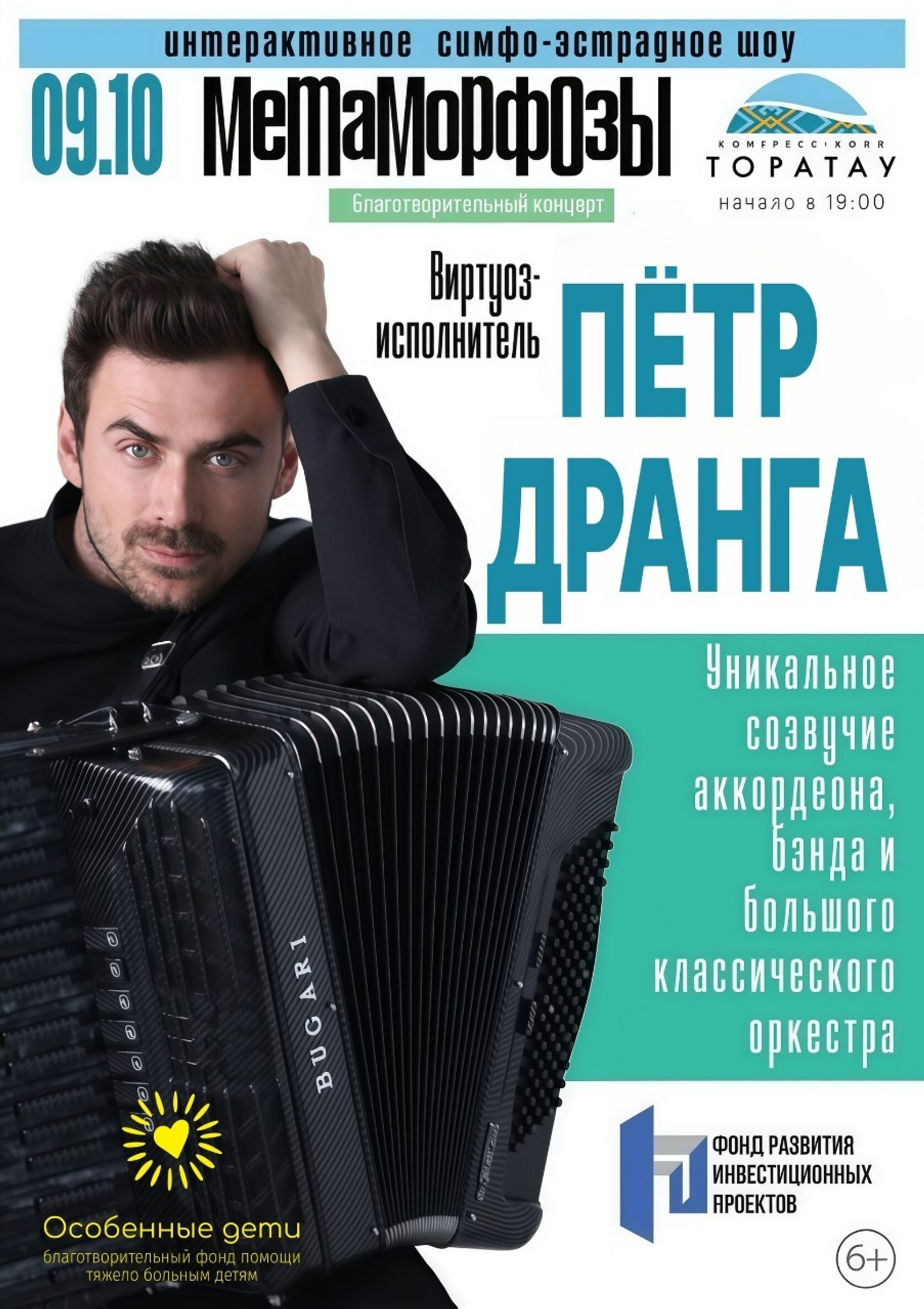 Петр Дранга — один из самых ярких представителей современной российской инструментальной сцены. Он известен своим инновационным подходом к аккордеону, сочетая этнические мотивы с классикой, электроникой и элементами эстрады. В программе «Метаморфозы» прозвучат авторские композиции, а также известные мировые произведения в оригинальных интерактивных аранжировках с участием симфонического оркестра. Специальный гость — виртуозная скрипачка Арсения Сибилёва.