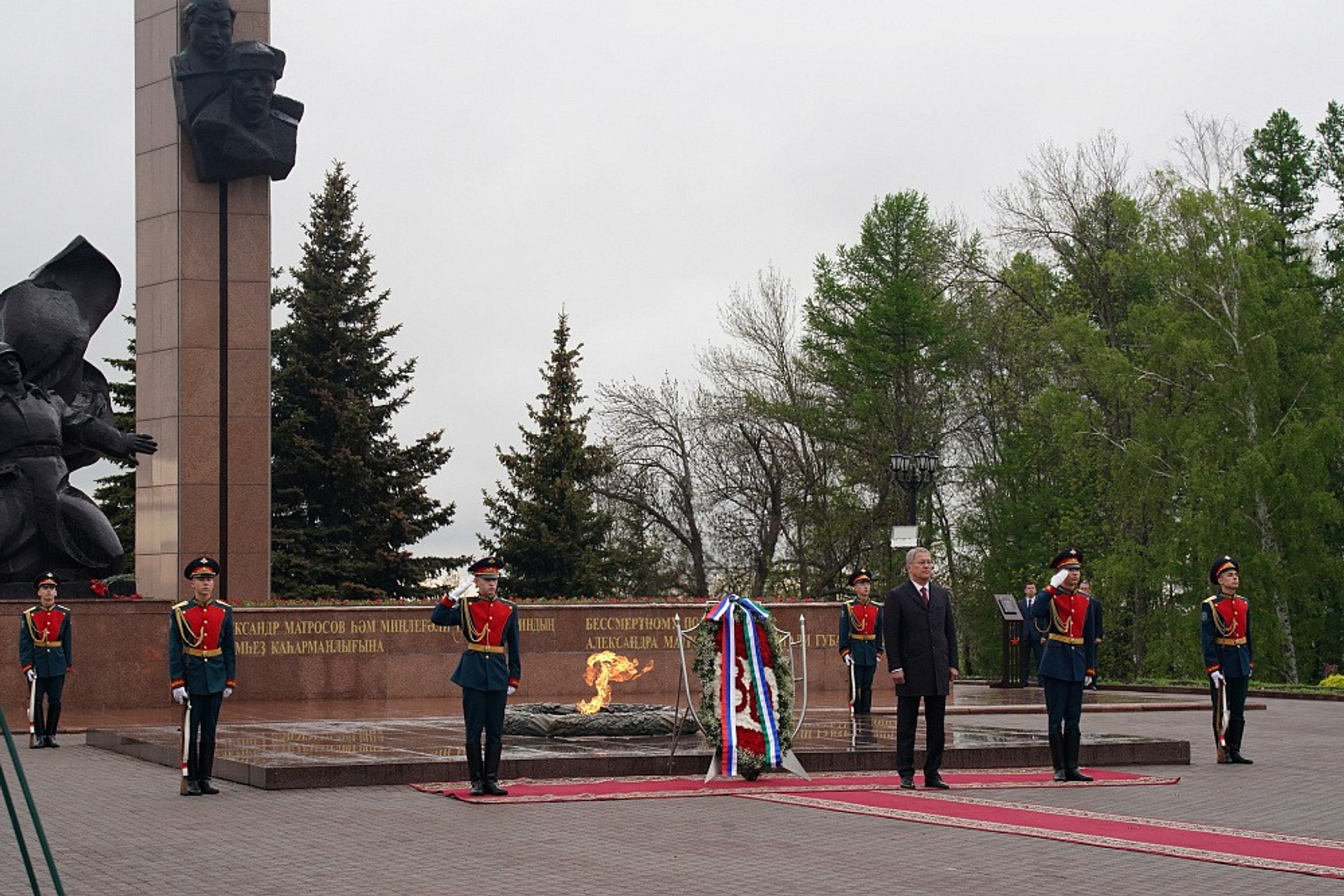 От имени многонационального народа республики руководитель региона возложил венок Славы к памятнику, посвящённому бессмертному подвигу Героев Советского Союза Александра Матросова и Миннигали Губайдуллина, у подножия которого горит Вечный огонь.